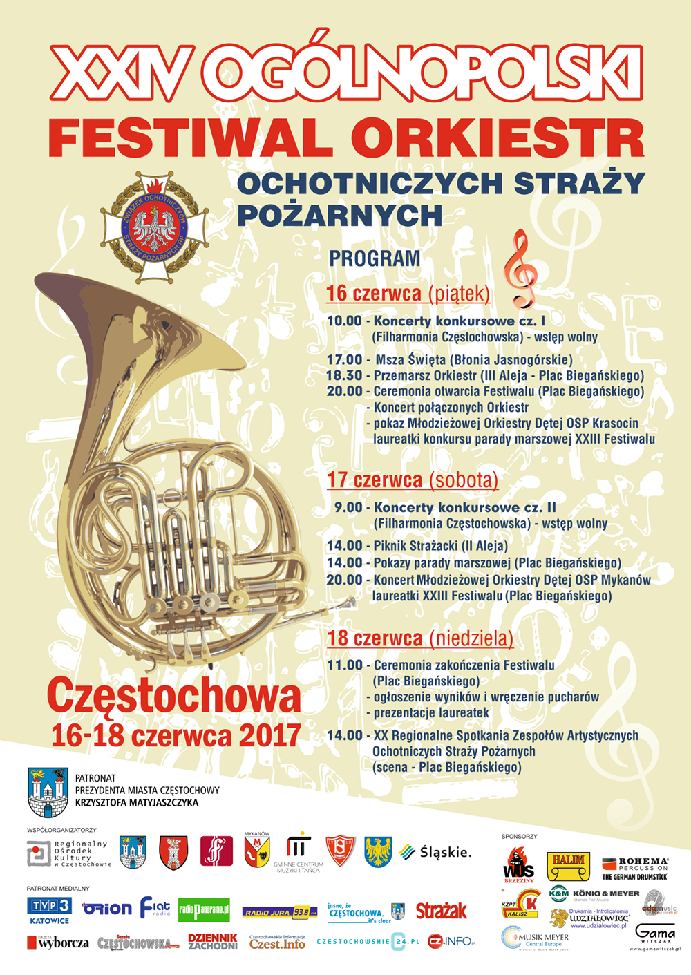 XXIV Ogólnopolski Festiwal Orkiestr Ochotniczych Straży Pożarnych odbędzie się w dniach 16, 17 i 18 czerwca 2017 r.